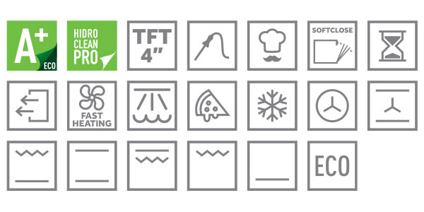 - Chức năng nấu liu riu: nấu nhiệt độ thấp kếthợp với hấp, nướng pizza, rã đông và chứcnăng ECO.