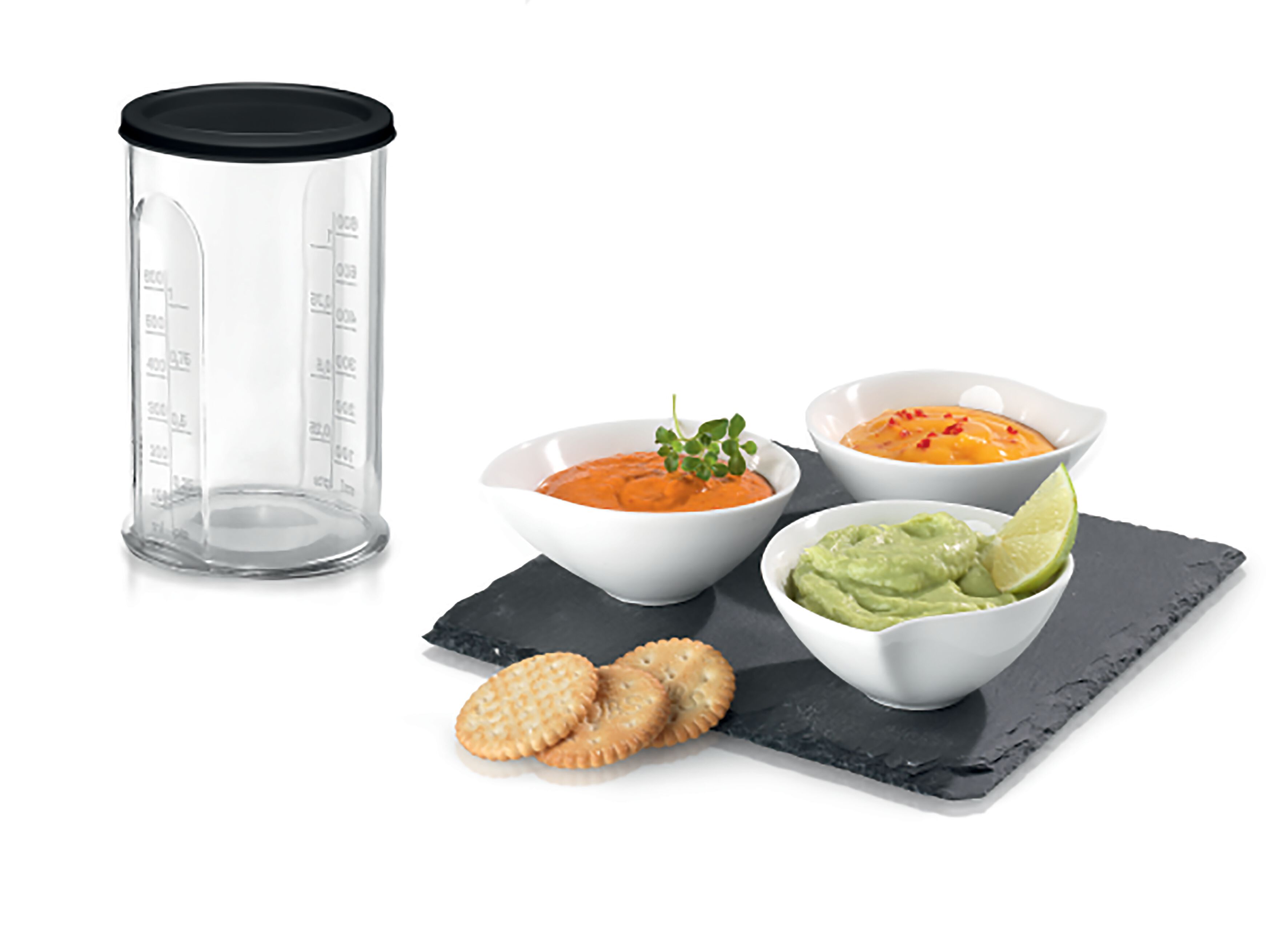 Phụ kiện đi kèm: 2 nắp; 1 cốc trộn (2 lưỡi dao); 1 cối xay; 1 chân trộn thép không gỉ; 1 lồng đánh trứng;